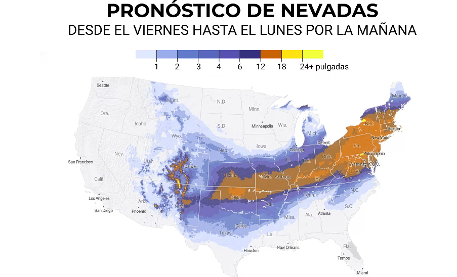 - Washington D. C.: Entre 15 y 25 centímetros de nieve (6 a 10 pulgadas) y hasta 2,5 centímetros de hielo (1 pulgada), con la nevada extendiéndose hasta el lunes.